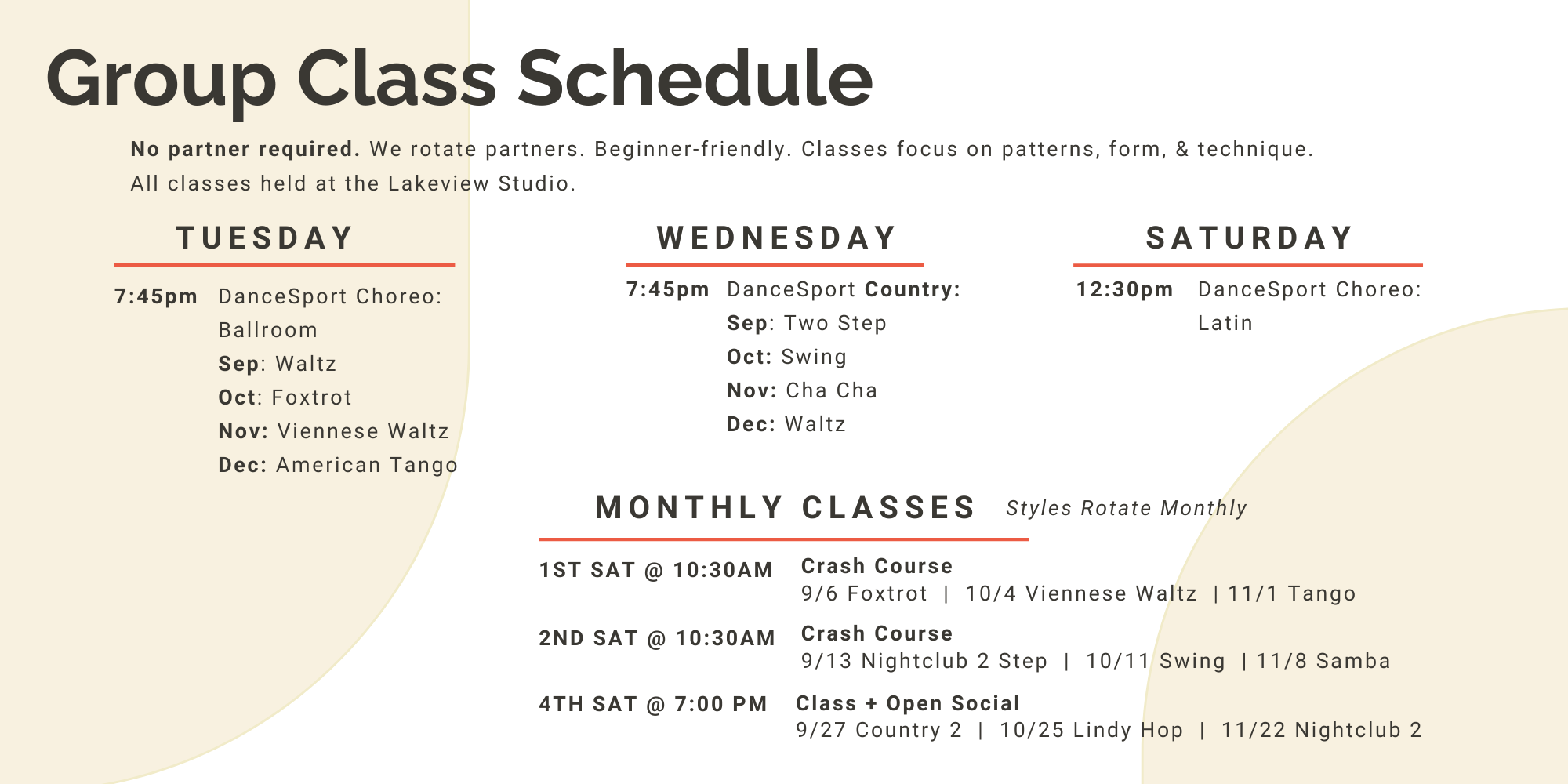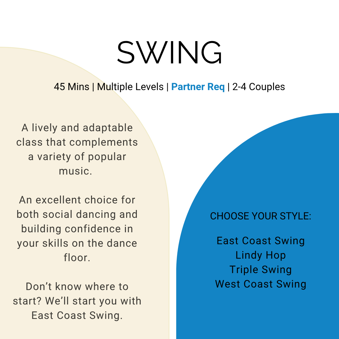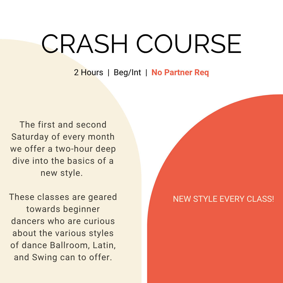 If you’re looking for a group class with partner rotation, we welcome both solo dancers and those with partners in our Crash Courses, our 4th Saturday Socials, and our Dancesport Group Classes.